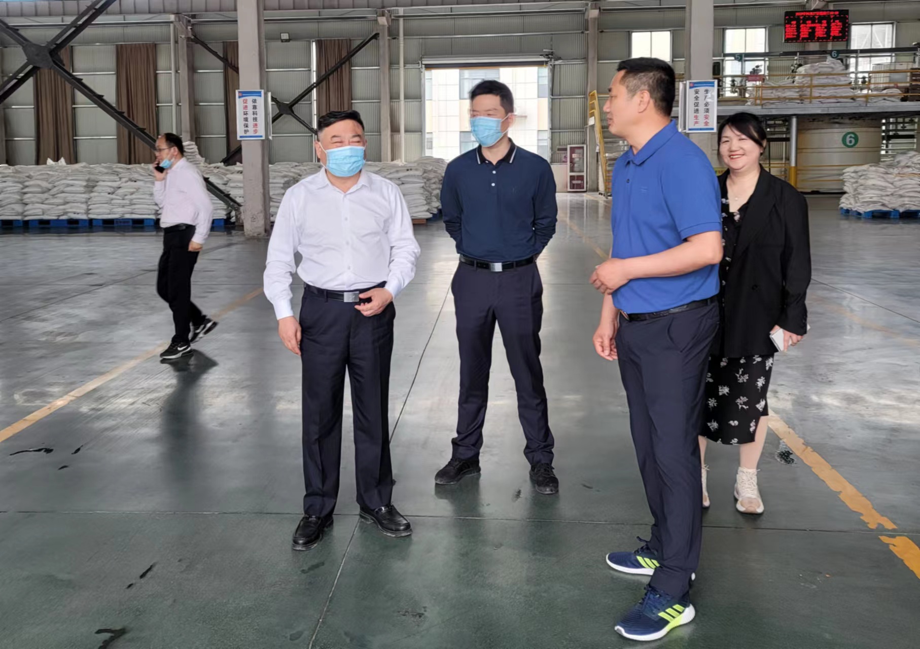 2022年4月27日上午,霍山县县委书记张守锐来森普公司视察工作,图中森普公司总经理张总正在与张书记介绍车间生产情况。